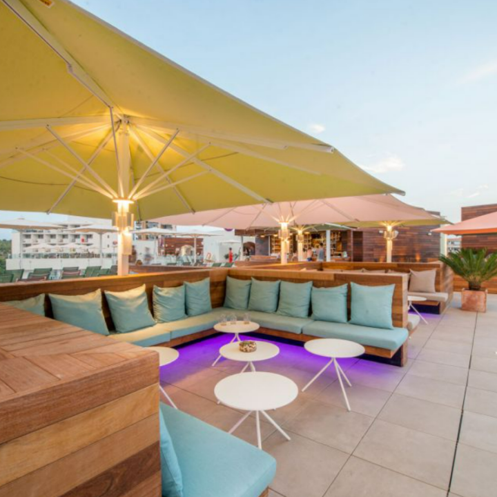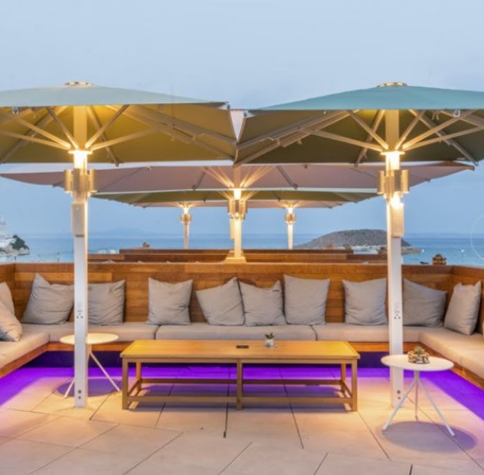 - Iluminación LED en varillas y mástil a dos caras con conexión directa y opción batería, calefactores, cierre perimetral, canalización de agua entre parasoles, personalización de faldones con logotipos. Lona interior personalizada y logotipos en faldón retroiluminados.